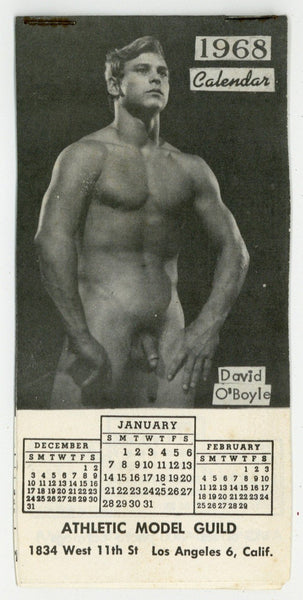 DETAILS: Original 1968 Athletic Model Guild pocket calendar featuring the photography of Bob Mizer. Originally sold through the adverts in Physique Pictorial magazine. Some of the male models include: David O'Boyle, Jim Carrol. Mike Hudson, Albert Aldridge, among others. Among the earliest examples of a gay calendar. Twelve pages in length. 5.5" x 2.75" inches. Rare.