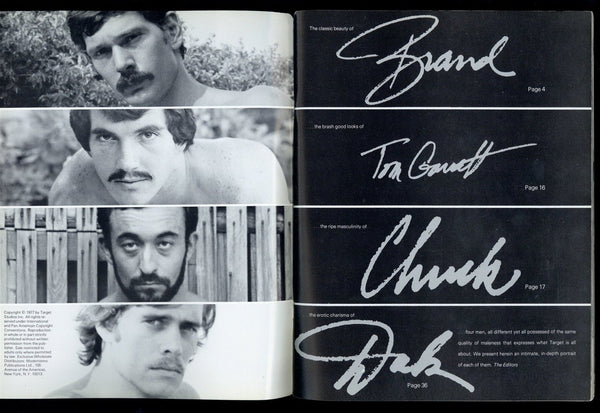 BACKGROUND: Target Studios was founded by photographer and filmmaker Lou Thomas (nee. 1933) and his partner Bob Lewis in 1974. Thomas had previously been partnered with Jim French in Southern California running Colt Studio's. After their breakup he relocated to Canal Street in New York City and established Target. The new company relied on mailing lists of various physique-era companies that had recently folded, among them Kris of Chicago (Chuck Renslow). Target continued the business practices that Thomas had established at Colt. It sold a broad selection of published gay art including magazines, photo sets of nude models, lithographic prints, calendars, illustrations by Etienne and later 8mm films. Thomas shared several models with Colt Studio. Because of their past relationship and close working relationship both Colt and Target tended to mimic each other with hyper-masculine, mustache, and leather men during the 1970's and 1980's. Target is considered by many to be among the most important gay content production studio's during the Golden Age of Porn.